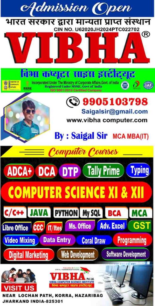 Vibha computer science is the best most top institute in hazaribagh of computer science The director of vibha computer science Mr kairav saigal is the one of the most best teacher of computer science I am also the student of this institute pls comes one time in this institute for learn computer science (This institute is situated at lochan path matwari hazaribagh ).
